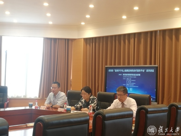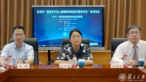 北京时间7月24日上午,教育部“留美学子线上健康咨询和诊疗服务平台”系列讲座的第六场在复旦大学枫林校区开讲。这场以“新冠疫情期间的应急管理”为题的讲座也是该系列讲座的最后一场,由复旦大学附属中山医院副院长、中山医院第四批支援武汉医疗队领队朱畴文和复旦大学附属华山医院副院长、华山医院支援武汉医疗队总指挥马昕主讲,复旦大学上海医学院医院管理处副处长汤罗嘉主持。