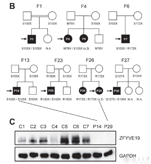 图5. ZFYVE19缺陷病人家系图显示符合常染色体隐性遗传,病人肝组织中ZFYVE19蛋白缺失。