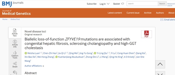 图1. 论文《ZFYVE19缺陷相关先天性肝纤维化、硬化性胆管炎和高GGT胆汁淤积症》由Journal of Medical Genetics在线发表