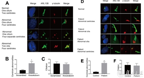 图7. 细胞实验证实,敲低ZFYVE19可以使细胞形成异常数目和形态的中心粒及纤毛