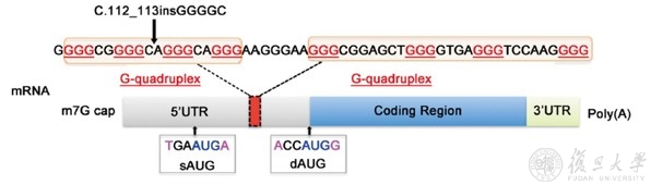图8. ZFYVE19的mRNA结构重新分析发现以往数据库中注释蛋白翻译起始位点错误。sAUG:注释翻译起始位点。dAUG:实际翻译起始位点