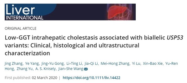 随着经济社会的日益发展,儿童肝病的疾病谱在数十年间发生了巨大转变,由原来以传染性肝炎为主,逐渐转变为以遗传性肝病等罕见病为主。作为国内最大的儿童肝病诊治和研究中心,复旦大学附属儿科医院肝病科在多年的临床工作中积累了丰富经验,并在立足于临床病人的科研中收获了诸多成果。2017年,王建设教授领衔的肝病团队鉴定了MYO5B缺陷引起的低GGT胆汁淤积症谱系,被国际上公认为家族性胆汁淤积症6型(图3)。今年3月,该团队又在国际上率先报道了一组由USP53缺陷引起低GGT胆汁淤积症谱系,详细阐述了该病的临床特征及病理特征,并揭示了这一新基因与已知低GGT胆汁淤积症致病基因TJP2的潜在关联(图4)。而近期报道的ZFYVE19则是全球首次关于该基因致病的报道,临床上表现为先天性肝纤维化、硬化性胆管炎和高GGT胆汁淤积症。