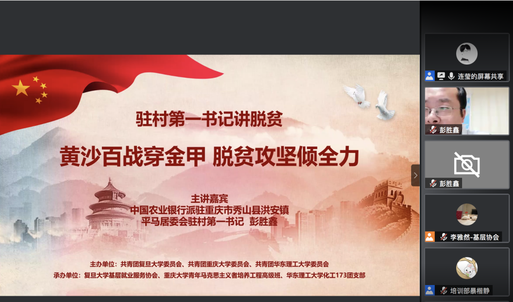 8月13日晚,“百名驻村第一书记讲脱贫”系列讲座通过腾讯会议开展,哔哩哔哩网站同步直播。中国农业银行派驻重庆市秀山县洪安镇平马居委会的驻村第一书记彭胜鑫同志结合自身驻村扶贫经历向同学们讲述了自己的一线扶贫故事,带领平马居委会搭建了完整的产业发展架构,形成了涵盖茶叶、银杏和扶贫车间等多样化的扶贫产业发展体系,并通过金融扶贫解决致富带头人的资金问题,实现了平马居委会扶贫工作从“输血型”向“造血型”的转变。同时,积极争取资金提升平马教学环境,实现志智双扶。复旦大学、重庆大学和华东理工大学共600余名学生参与了线上学习活动。