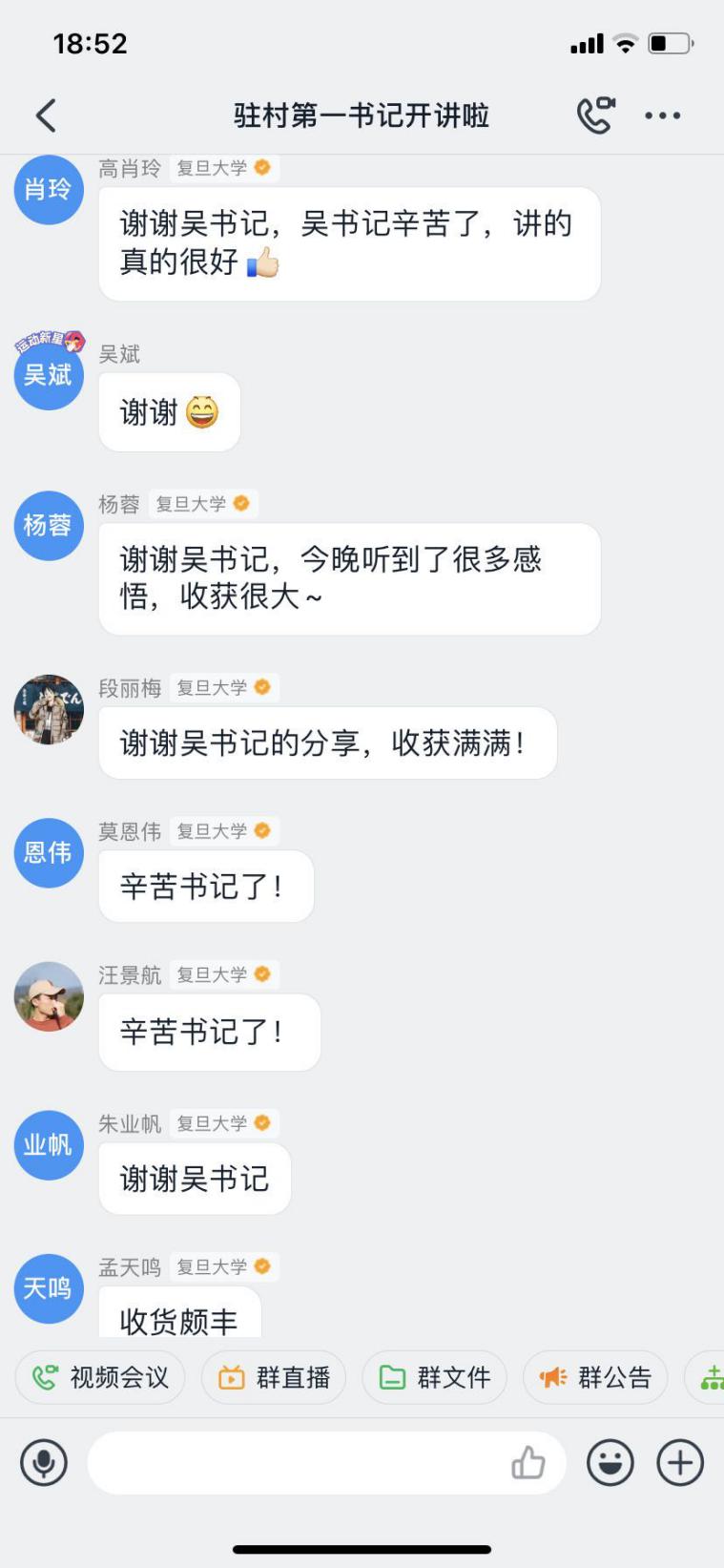 “听了讲座,我对驻村第一书记这一群体及他们在一线扶贫的故事有了更多了解,也深受感动。习总书记在给我校青年党员志愿者回信中勉励大家‘在学思践悟中坚定理想信念,在奋发有为中践行初心使命。’作为一名高校学子和新时代的青年,我们要认真学习与领悟回信精神,并将之运用到实践当中去。沿着驻村第一书记的步伐,走出学校,走向社会,走向基层。用足迹丈量祖国的每一寸土地,助力脱贫攻坚事业,不忘初心,永久奋斗。”听完由复旦大学团委发起的“百名驻村第一书记讲脱贫活动”讲座后,复旦大学社会发展与公共政策学院2019级硕士生郝言芝同学分享了自己的心得体会。