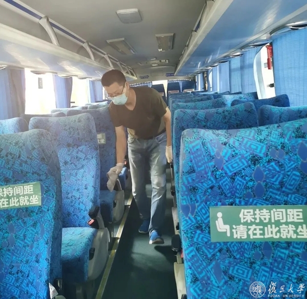 认真执行疫情期间“每程一消毒”的规定,车上应急防疫物资配足配齐,师生分散隔开乘坐,乘车人数不得超过座位数的50%,并在车厢后部预留一排座位供途中应急留观使用。