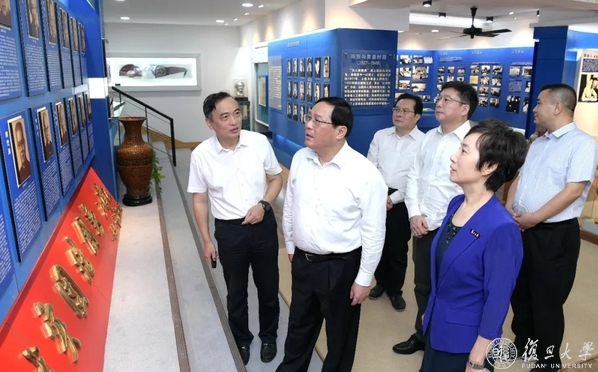 在上医校史馆,复旦大学党委副书记、上海医学院党委书记袁正宏介绍了上医的历史,特别是1927年颜福庆老校长创办中国第一所国立大学医学院、抗战西迁保存医学教育火种、新中国初期涌现16位一级教授、参与抗美援朝战争、投身防治血吸虫病、溯江而上创建重庆医科大学、培养了50余名院士,以及2000年两校合并开启综合性大学办医学院新征程、2018年底部委市三方共建托管复旦大学上海医学院及其直属附属医院为上医发展注入新活力等,尤其介绍了今年以来复旦上医参与抗疫的主动作为。李强书记仔细聆听,并不时就一些问题进行询问。