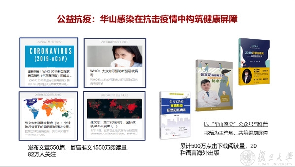 “疫情防控工作之外,我们发现谣言比疾病更可拍,1月16日武汉新冠疫情尚不明朗之时,华山感染的张文宏医师团队就翻译了世界卫生组织最新的抗新冠指南,为临床医护人员提供指导,在18日又发布了大众科普版的指南,为大众正确认识新冠病毒不断地发声。”