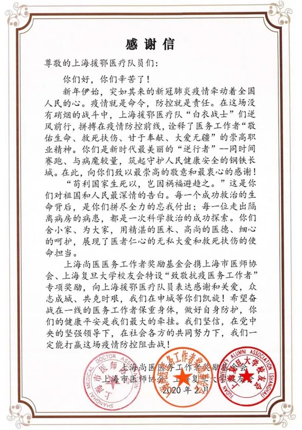 疫情发生后,基金会在现任会长、1968届上海第一医学院(现复旦大学上海医学院)校友俞卓伟的带领下,第一时间发起“致敬抗疫医务工作者”公益项目,项目筹措资金1300万元,筹集医疗防护用品、食品、日用品等紧缺物资共17万余件,价值510万元。其中,由尚医基金会联合上海复旦大学校友会发起的抗疫公益行动,为上海援鄂医疗队队员及其家属筹集了430余万元奖励与慰问基金,向逆行的白衣战士送去了满载复旦人的关爱与温暖。