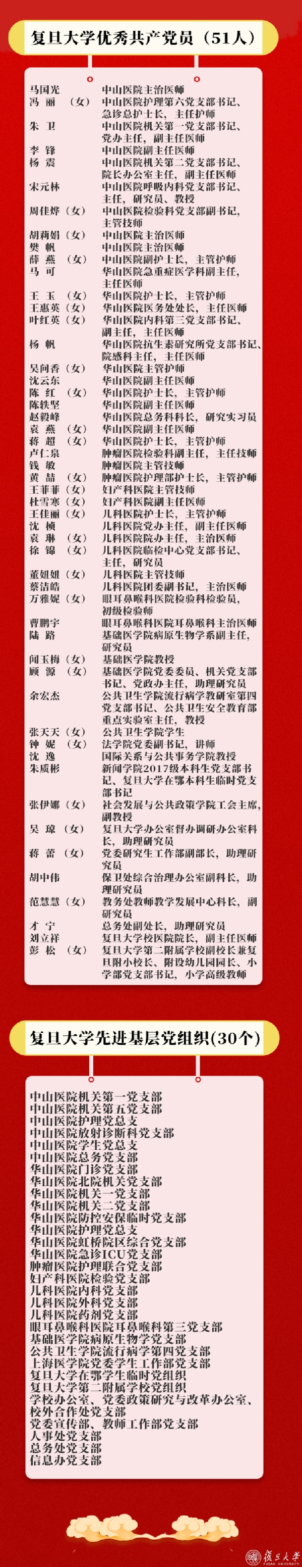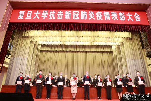 校长许宁生主持大会,校党委副书记、上海医学院党委书记袁正宏和校党委副书记、副校长周亚明宣读表彰决定。校领导向复旦大学抗击新冠肺炎疫情先进个人、先进集体代表,复旦大学优秀共产党员、先进基层党组织代表颁发荣誉证书和奖牌。961名先进个人、102个先进集体和51名优秀共产党员、30个先进基层党组织受到表彰。受邀出席大会的还有教育部高校党建工作联络员、同济大学原常务副校长陈小龙。