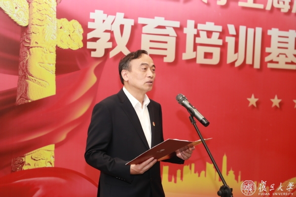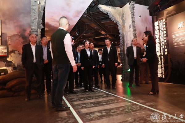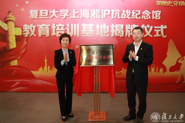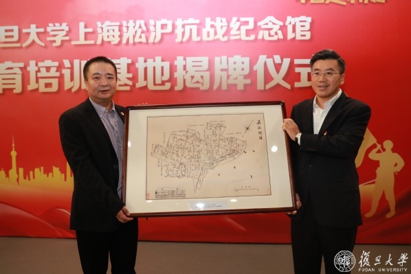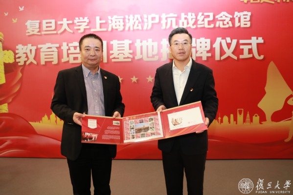 参观期间,复旦大学教育培训基地挂牌仪式在淞沪抗战纪念馆举行,焦扬和陈杰为培训基地共同揭牌,金力代表学校接受高奕奕赠送的《吴淞乡图》并回赠《共产党宣言》中文全译本出版一百周年纪念邮折,袁正宏主持揭牌仪式。