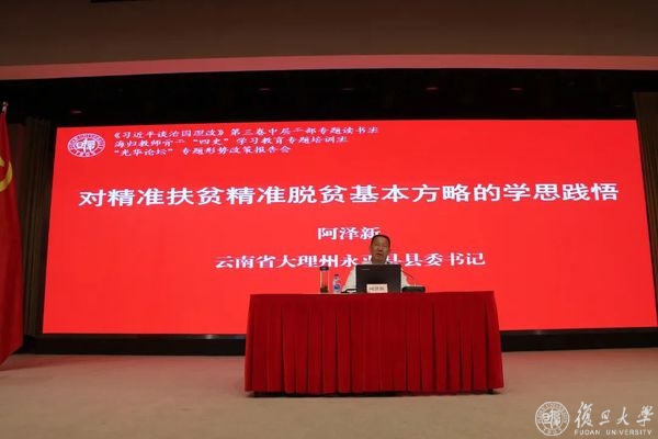 11月10日下午,复旦大学“《习近平谈治国理政》第三卷中层干部专题读书班”和海归骨干教师“四史”学习教育专题班在复旦大学邯郸校区开讲,专题报告会的主题是《对精准扶贫精准脱贫基本方略的学思践悟》,由复旦定点帮扶、脱贫摘帽的云南永平县委书记阿泽新主讲。