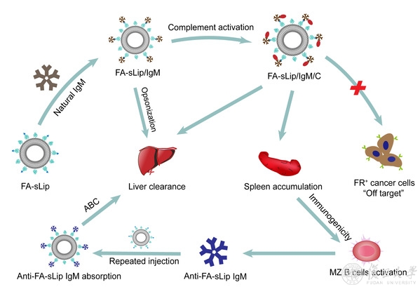 占昌友课题组研究发现,当叶酸修饰的脂质体入血后,大量吸附天然IgM,并导致一系列预期之外的效应。一是脱靶效应。叶酸分子特异性结合天然IgM后丧失与叶酸受体的结合活性,无法有效靶向叶酸受体高表达的肿瘤细胞。二是快速清除。吸附天然IgM的脂质体易激活补体系统,导致叶酸修饰的脂质体在肝、脾等器官被快速捕获并蓄积。三是增强免疫原性。刺激脾脏边缘B淋巴细胞,产生特异性抗体,导致再次注射脂质体时加速清除现象。天然IgM对叶酸修饰的聚合物纳米粒也有影响,该研究揭示了天然IgM为叶酸结合蛋白,在负调控叶酸修饰的纳米药物体内性能中发挥关键作用。