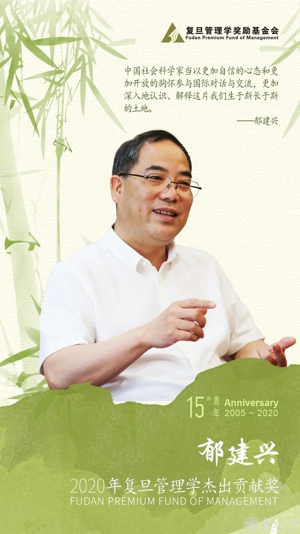 “复旦管理学杰出贡献奖”获奖人郁建兴主要从事政府管理、公共政策、社会治理等领域的研究。在政府管理领域,他通过深度解析源自浙江省的“最多跑一次”及其相关改革,提出了“以民众为中心”的公共管理这一理论框架,为全球公共管理面临的“政府中心主义”问题,提供了可能的解决方案。在公共政策领域,他提出以机会导向、内生创新为重点的“内源发展”新战略,为国家加强改善农业农村政策提供了新思路;同时,他参与提出、完善“县域医共体”概念和政策方案,并为在浙江省的成功实施发挥了重要作用。在社会治理领域,他以行业协会、商会、社区社会组织为主要研究对象,重点开展了政府与社会组织的合作治理研究,提出了中国社会组织“在参与中成长”“调适性合作”等概念,并与地方政府共同提出并实践了基层社会治理中自治、法治和德治“三治融合”及相关基层治理改革。