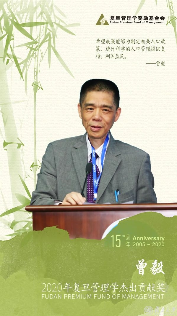 “复旦管理学杰出贡献奖”获奖人曾毅主要从事人口政策与管理、人口分析方法与应用的研究。在人口分析和相关政策方面,他开创性地研究了中国出生性别比升高成因及其对策,呼吁实行国家扶持保底的农村养老保险,分析论证了生育政策调整改革的必要性和可行性,为国家决策提供科学依据。在健康老龄研究方面,他主持开展了“中国老年健康影响因素跟踪调查研究”项目,历时20多年对11.3万人次进行了8次跟踪调查,收集的数据和DNA样本为我国开展老年健康影响因素和跨学科创新研究以及老年健康全基因组测序研究提供了宝贵数据资源,也为我国填补这一跨学科研究领域的空白奠定了坚实基础。在多维家庭人口预测分析方法创新及应用研究方面,他建立了包括男、女两性全体人口且人口事件发生率随时间变化的ProFamy多维家庭人口预测模型、软件及应用,克服了经典预测方法的局限,成功地对家庭户、老人成人儿童居住安排和人口规模结构进行预测,并在国内外得到广泛认可和应用。