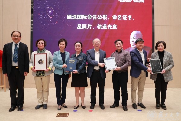 苏步青先生家属代表获颁国际命名公报、命名证书、星照片和轨道光盘,“苏步青星”铜匾揭幕。
