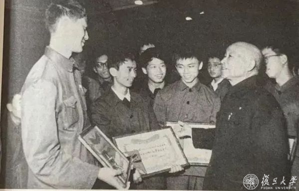 1978年,在上海市数学竞赛颁奖大会上苏步青为第一名李骏颁奖。