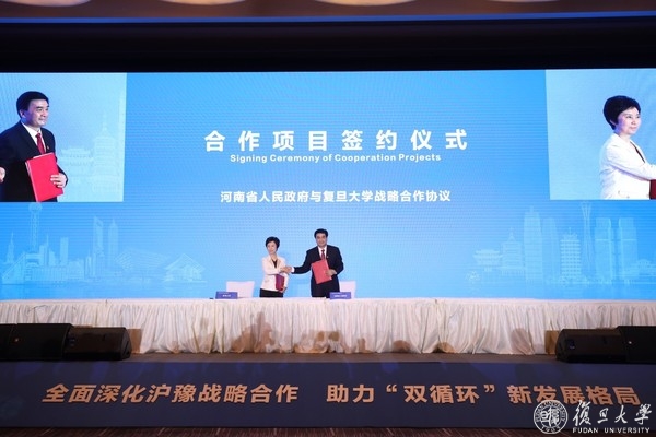 11月17日,沪豫合作交流会暨项目签约仪式在上海举行,复旦大学与河南省签署战略合作协议。河南省委书记王国生、省长尹弘、省政协主席刘伟,上海市副市长宗明出席会议并见证签约。