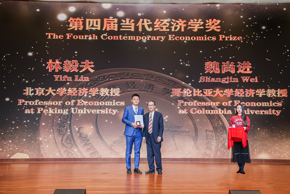 第二十届中国经济学年会暨当代经济学奖颁奖盛典于12月5日晚在深圳举行。复旦大学泛海国际金融学院学术访问教授、哥伦比亚大学终身讲席教授魏尚进与北京大学博雅讲席教授、新结构经济学研究院院长林毅夫获颁2019年第四届当代经济学奖。