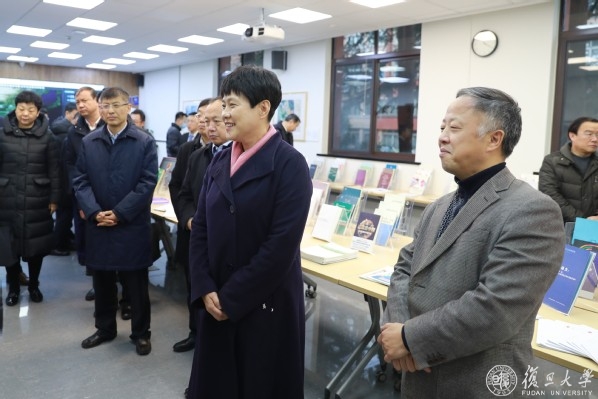 会谈结束,曲孝丽一行来到智库楼,参观复旦大学智库建设和咨政育人成果展。