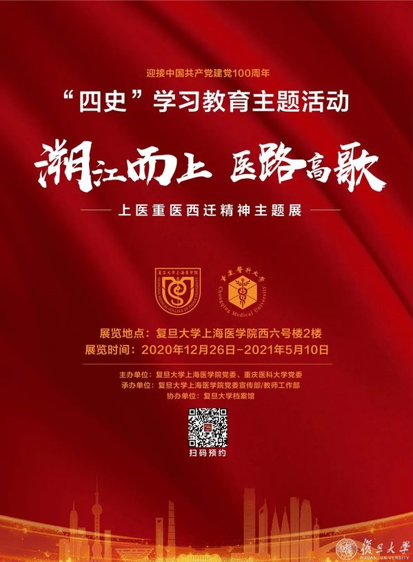 从黄浦江畔到嘉陵江边,复旦大学上海医学院和重庆医科大学有着同气连枝、血浓于水的历史渊源。2020年是上医抗战迁渝80周年、分迁筹建重医65周年。为贯彻落实习近平总书记重要讲话精神,迎接中国共产党建党100周年,深入开展“四史”学习教育活动,铭记两度迁渝奋斗史,传承弘扬“西迁精神”,12月26日,“溯江而上 医路高歌”上医重医西迁精神主题展在复旦大学上海医学院开幕。