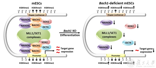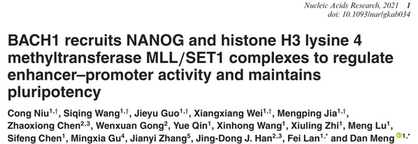细胞的命运决定受到转录因子与表观遗传因子的协同调控,例如胚胎干细胞的多能性维持,既需要关键转录因子的正确结合,又需要对启动子和增强子活性的精确调控,两者密不可分。因此,研究转录因子与表观遗传因子如何协同作用维持干细胞多能性是亟需解决的科学问题,对细胞命运决定具有重要的意义。近日,复旦大学基础医学院教授孟丹团队与生物医学研究院研究员蓝斐团队合作揭示了转录因子与表观遗传因子协同调控干细胞命运决定的新机制。1月27日,研究成果以《BACH1招募NANOG和组蛋白H3赖氨酸4甲基转移酶MLL/SET1复合物调节增强子-启动子活性并维持干细胞多能性》(“BACH1 recruits NANOG and histone H3 lysine 4 methyltransferase MLL/SET1 complexes to regulate enhancer–promoter activity and maintains pluripotency”)为题在线发表于《核酸研究》(Nucleic Acids Research)。该研究揭示了转录因子BACH1(BTB and CNC homology 1)在维持小鼠胚胎干细胞多能性和决定干细胞命运中发挥的关键作用及作用机制,对于干细胞命运调控的研究具有重要的科学意义。