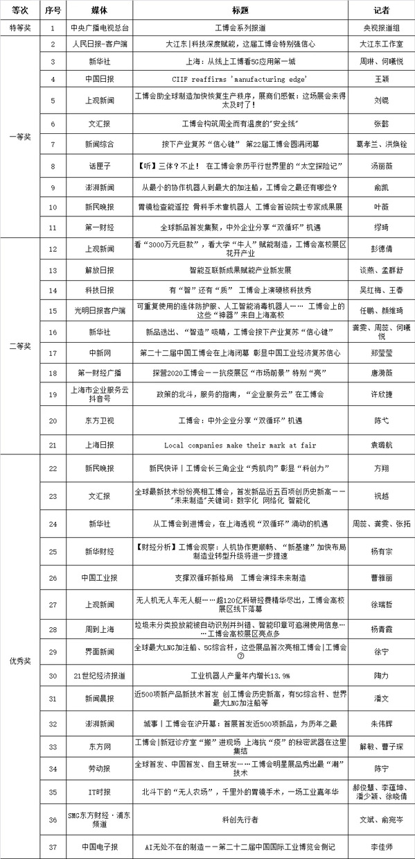 据悉,工博会举办22年来,已经打造成为上海的重要城市名片,是目前全球规模最大的工业展会之一。第22届中国国际工博会展会媒体传播实现了新突破,覆盖超过3亿人次,其中线上观展达到千万人次;顺应新媒体发展潮流,创新举办“工博会抖音短视频挑战赛”;监测到平面媒体、主要网络媒体、主要广电媒体相关原发报道超过3000篇。经前期初选、专家评审、网上公示,第22届中国国际工业博览会组委会新闻部最终确定37项新闻作品入选“好新闻”,其中包括特等奖1项、一等奖10项、二等奖10项、优秀奖16项。