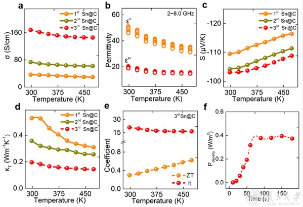 图2. 锡/碳复合材料的(a)电导率,(b)介电常数,(c)赛贝克系数,