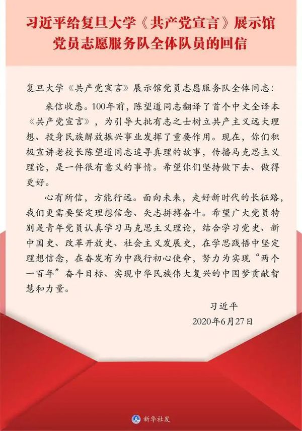 8个多月前,习近平总书记给复旦大学《共产党宣言》展示馆党员志愿服务队全体队员回信,肯定他们积极宣讲老校长追寻真理的故事,传播马克思主义理论。