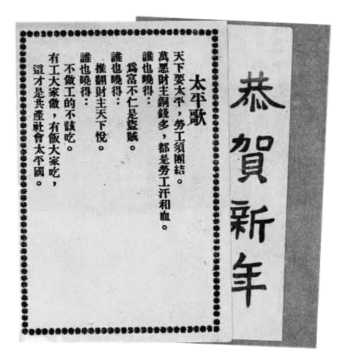 一张1922年新春风靡上海的贺年卡,上面的《太平歌》就是陈望道起草的。他用170个字浓缩了宣言近20000字的核心要义,语言质朴平实又鲜活,正是传播马克思主义的创新实践。