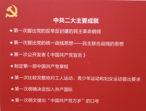 1922年7月,中共二大在上海拉开帷幕,会议第一次提出党的民主革命纲领、第一次提出党的统一战线思想,制定了第一部《党章》、第一次公开发表了《中国共产党宣言》、第一次比较完整地对工人运动、妇女运动和青少年运动提出了要求、第一次提出了“中国共产党万岁”的口号,为中国革命指明了方向。