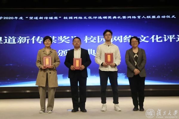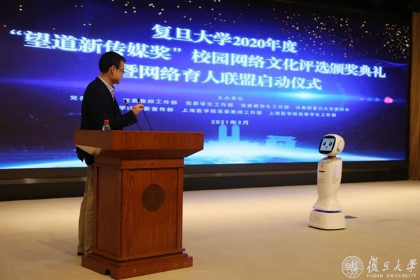 “老师们、同学们,我们的活动即将开始,请尽快就座,并将手机调至震动或静音,谢谢!” 3月30日下午,复旦大学2020年度“望道新传媒奖”校园网络文化评选颁奖典礼暨网络育人联盟启动仪式在一位“特别”的司仪、机器人助理辅导员小云的引导下开启。校党委副书记尹冬梅出席典礼并讲话,学校宣传、学生工作部门负责人参加典礼并为获奖单位和个人颁奖。