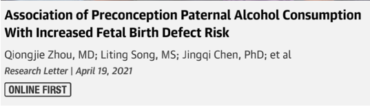北京时间4月20日凌晨,JAMA Pediatrics杂志在线发表了题为“Association of Preconception Paternal Alcohol Consumption With Increased Fetal Birth Defect Risk”的研究论文。该研究由复旦大学附属妇产科医院“周琼洁-李笑天课题组”与复旦大学类脑智能科学与技术研究院青年副研究员陈靖祺课题组等合作完成。该研究首次以流行病证据提示,男方孕前饮酒可能增加子代出生缺陷风险,可能与精子发育和表观遗传修饰调控有关,而改变饮酒行为可能会降低这种风险。
