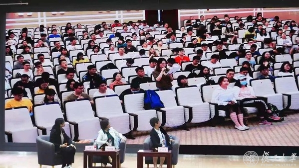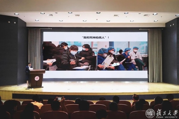 李圣青以“践行医者初心使命,弘扬伟大抗疫精神”为题,在党课报告中向现场师生分享了复旦大学附属华山医院第四批援鄂医疗队在武汉奋战的经历。抗疫期间,一名名医护人员挺身而出,抱着“抗疫必胜”“队友一个不少地平安回来”的信念,和疫情赛跑、和时间赛跑。这是华山医院秉承的红十字文化——“救死扶伤、仁爱奉献”的体现;是复旦上医传承的“为人群服务”的精神体现;更是习近平总书记深刻概括的伟大抗疫精神——“生命至上、举国同心、舍生忘死、尊重科学、命运与共”的体现。