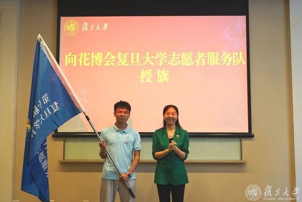 5月18日,“小白鹭”出征仪式在复旦大学光华楼举行,校党委副书记尹冬梅向志愿者授旗,勉励并祝愿志愿者们圆满完成志愿服务工作,平安归来。校团委书记赵强为志愿者代表发放志愿者装备。