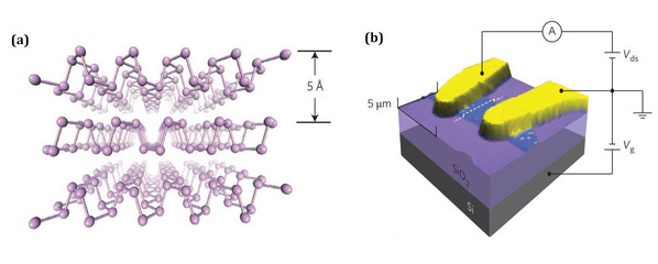 (a) 二维黑磷的晶体结构;(b)项目制备的二维黑磷场效应晶体管