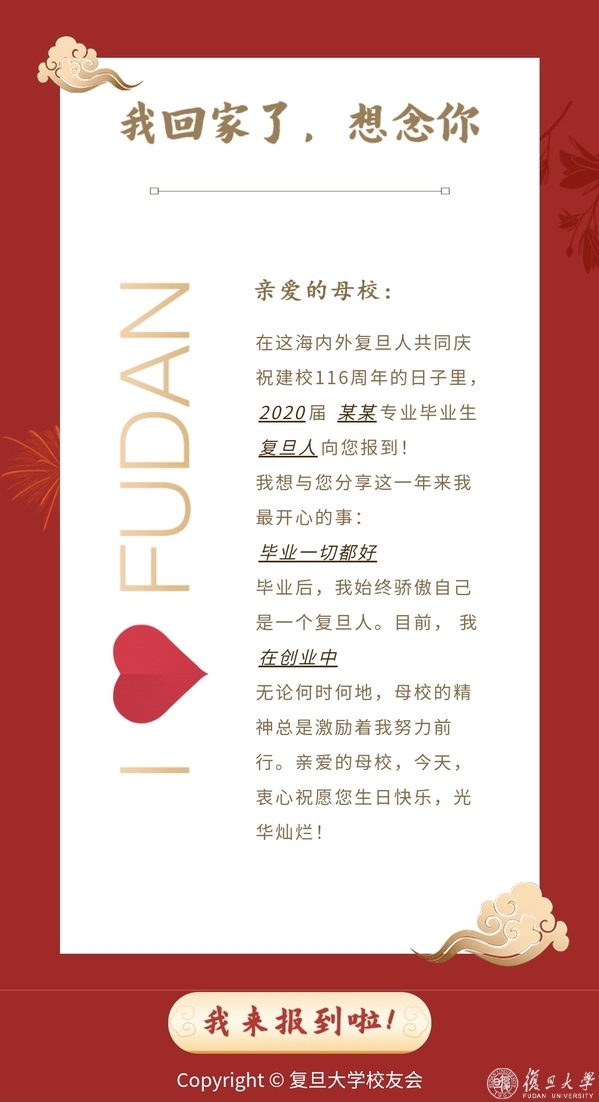 在“云报到”板块中,校友们向母校报告自己工作生活的现状,叙一叙这一年中最开心的事情,用一封封“报到信”回应了母校对毕业生们永远的牵挂。