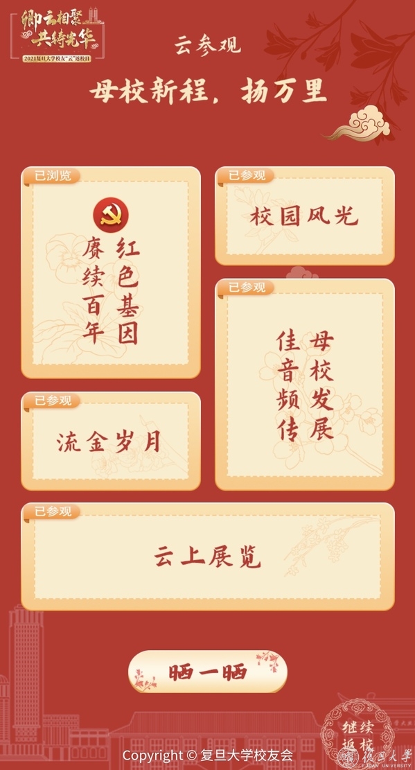 每位校友的“云”返校日之旅设有六大站点,包括“云报道——我回家了,想念你”“云合影——定格卿云,常忆起”“云聚会——久别重逢,老友记”“云参观——母校新程,扬万里”“云祝福——岁月鎏金,常如意”“云捐赠——爱在燕曦,不分离”,呈现了复旦深厚的人文底蕴,表达了校友与母校之间割舍不断的深情。