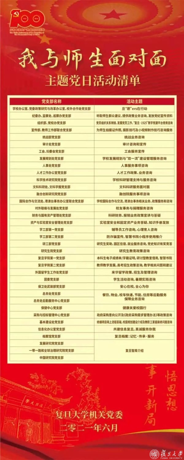 为隆重庆祝中国共产党成立100周年,深入推进党史学习教育,把学习党史与观照现实、为师生服务紧密结合, 6月1日中午,机关党委在光华楼东辅楼前广场举办“我与师生面对面”主题党日活动。机关党委39个在职教职工党支部共300余名党员参加此次活动。