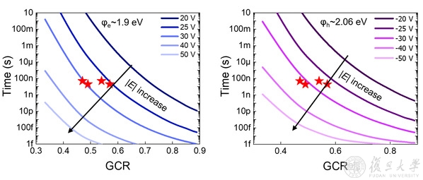 图2.存储器中电子与空穴编程速度与栅耦合比、电场的定量关系图