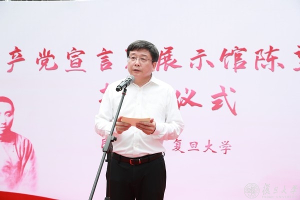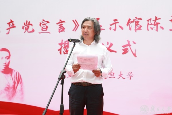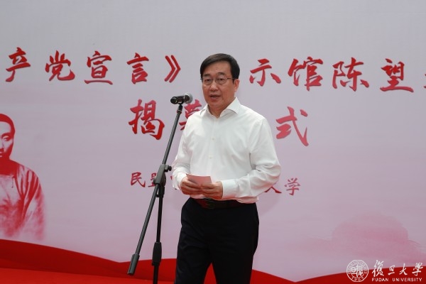 许宁生在致辞中代表复旦大学对民盟中央、民盟上海市委等各级领导对复旦的事业发展,对《共产党宣言》展示馆建设的关心支持,对著名雕塑家吴为山教授的倾心创作表示感谢。他指出,在全党全国庆祝中国共产党成立100周年之际,在深入学习贯彻习近平总书记给《共产党宣言》展示馆党员志愿服务队回信一周年的时刻,在望老旧居举行陈望道雕塑揭幕仪式,共同品味“真理的味道”,是为了更好地传承“宣言精神”,更好地讲述望老故事,更好地学习望道先生爱党爱国的情怀和追求真理的信念,从中汲取新时代奋进的力量。复旦大学将深入学习宣传贯彻总书记重要回信精神,落实好立德树人根本任务,培养好一代代“宣言精神”传人,保护好利用好校史红色资源,为实现第二个百年奋斗目标和中华民族伟大复兴的中国梦作出更大贡献。