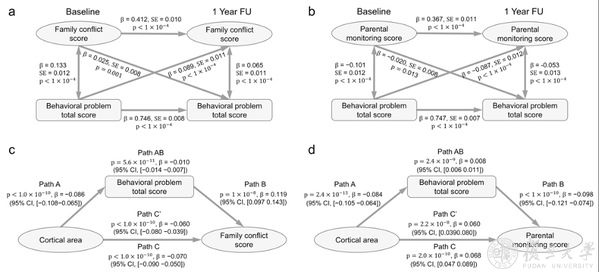 研究组进一步基于纵向随访数据,交叉滞后模型分析表明家庭环境与儿童心理健康呈互为因果的作用关系,而儿童心理健康与一年后的家庭环境有更强的关系,这表明除了家庭环境能够对儿童有显著影响之外,儿童的心理健康反过来对家庭环境也有很强的影响。而中介分析进一步表明儿童心理健康中介了家庭环境与儿童脑结构发育之间的关系,揭示了家庭环境与儿童心理健康关系的脑结构基础。