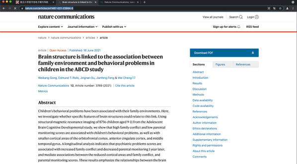 6月18日,相关研究成果以《家庭环境与儿童行为问题关系的脑结构基础》(“Brain structure is linked to the association between family environment and behavioral problems in children in the ABCD study”)为题发表于《自然-通讯》(Nature Communications),该研究首次揭示了家庭环境与儿童脑结构和心理健康的内在联系,为营造良好家庭环境促进儿童身心健康发展提供科学依据。