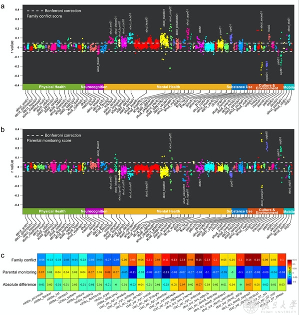 研究组基于美国青少年大脑认知发展研究(Adolescent Brain Cognitive Development Study)的公开数据库和前期儿童脑发育的工作基础,利用数学统计方法,对近万名儿童脑影像及行为随访数据(10至11岁)进行统计建模分析。首先,在行为学层面,研究发现家庭冲突与儿童心理健康如冲动行为、外向行为问题等呈显著正相关,而父母关怀与儿童心理健康呈显著负相关;这表明积极的家庭环境能够促进儿童身心健康发展,而消极的家庭环境下的孩子更容易出现心理健康问题。