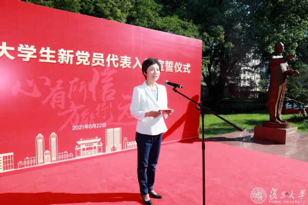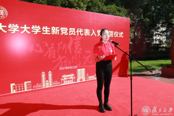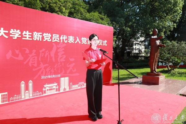 “我志愿加入中国共产党,拥护党的纲领,遵守党的章程……”在庆祝建党百年、习近平总书记给复旦大学重要回信精神一周年之际,6月22日下午,根据党中央安排,复旦大学党委组织大学生新党员代表举行入党宣誓仪式。校党委书记焦扬带领100名2021年大学生新党员在《共产党宣言》展示馆面对党旗庄严宣誓。