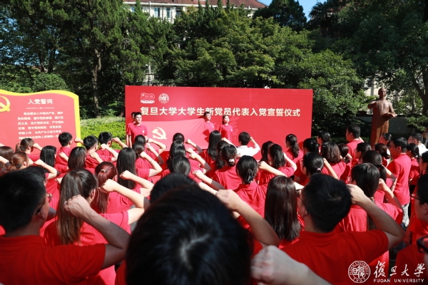 宣誓仪式开始,现场奏响《国际歌》。在焦扬的带领下,百名复旦大学生新党员在《共产党宣言》展示馆,右手握拳、举拳过肩,面向党旗庄严宣誓,许下对党和人民的郑重承诺: