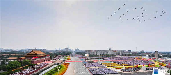 雄鹰翱翔,振翅长空。7时55分许,中国人民解放军71架战机飞向天安门广场,向党致敬,向祖国致敬,向人民致敬。空中护旗梯队拉开飞行庆祝表演序幕,5架直升机分别悬挂中国共产党党旗和写有“伟大的中国共产党万岁”“伟大的中国人民万岁”“伟大的中华人民共和国万岁”“全国各族人民大团结万岁”的条幅迎风向前。随后,直升机、战斗机分别组成“100”“71”字样掠过长空,15架歼-20飞机组成3个梯队呼啸而过,教练机拉出10道彩烟,精彩的表演激起一阵阵欢呼声。