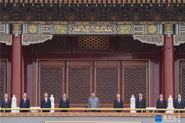 上午7时53分,在欢快的乐曲声中,习近平等党和国家领导人来到天安门城楼主席台,全场爆发出热烈掌声。