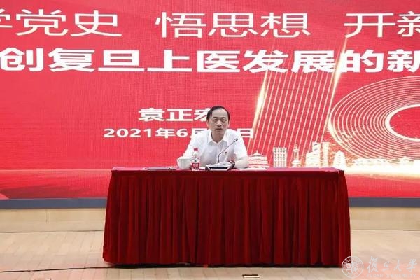 6月29日,校党委副书记、上海医学院党委书记袁正宏为复旦上医的党员同志上党史学习教育专题党课。袁正宏从中国共产党的百年辉煌历程,上医九十四载发展历史,上医的红色基因、光荣传统和精神血脉,上医发展新篇章四个方面,回顾上海医学院听党话、跟党走的奋进历程,展望新时代发展蓝图。