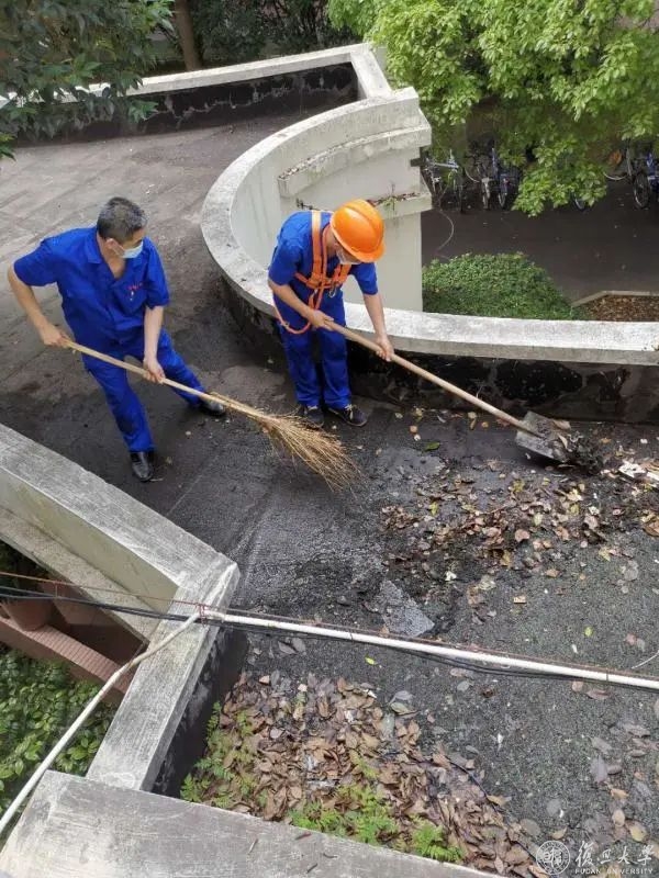 六是组织专业力量对排水不畅的排水口及时检修,清理楼宇屋顶的枯叶与垃圾,对景观水池预先排水,降低水位,保证校园排水系统通畅。