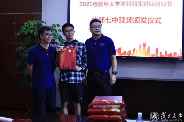 当天,包括罗雅萧在内,来自成都七中、树德中学、四川师范大学附属中学的49名“新复旦人”收到了复旦大学四川招生组老师亲手送上的复旦大学2021级新生录取通知书。